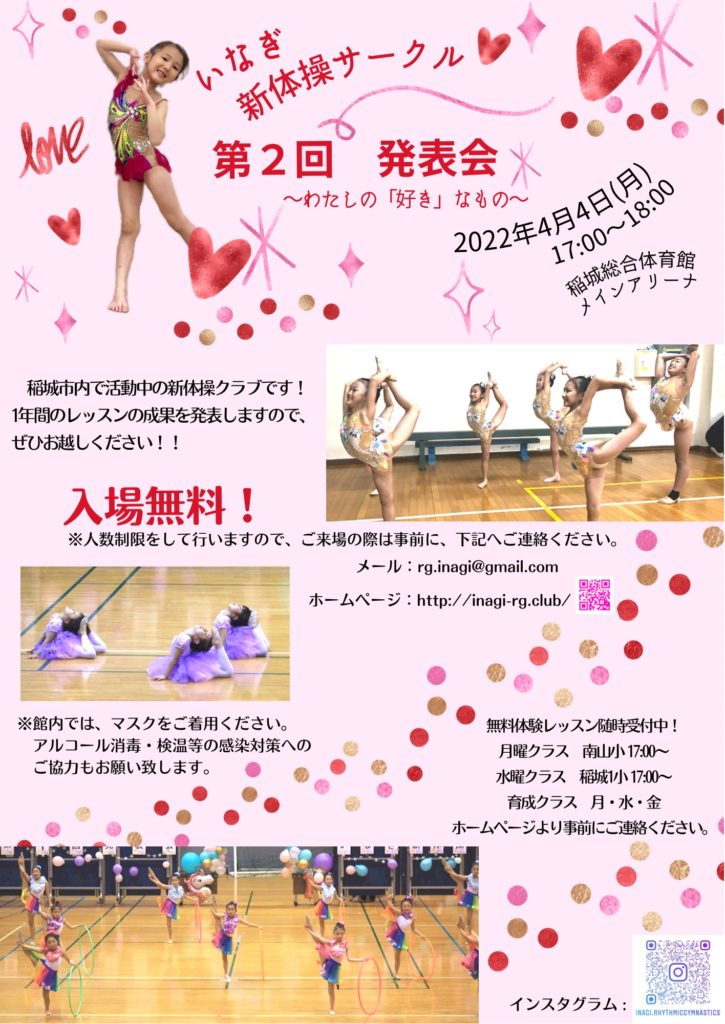 2022年4月 第2回発表会~わたしの「好き」なもの~ 2026 3/30 発表会アルバム 発表会アルバム 2021年3月 第1回発表会 2022年8月 若葉台夏まつり キッズクラスで参加 関連記事 2025年12月 第6回 発表会~不思議な博物館~ 2025年7月 東京ジュニア新体操選手権団体2部で3位入賞 2024年12月 第5回 記念 発表会~FROZEN~ 2024年12月 全日本ジュニア新体操選手権にて、エキシビション演技を披露 2024年9月 小1・2年キッズ団体で全日本クラ団に出場「オリジナル賞」受賞 2024年3月 第4回 発表会~むかしむかしあるところに~ 2023年3月 第3回 発表会~New Genesis~ 2022年9月 初めての全日本クラブ団体選手権 出場